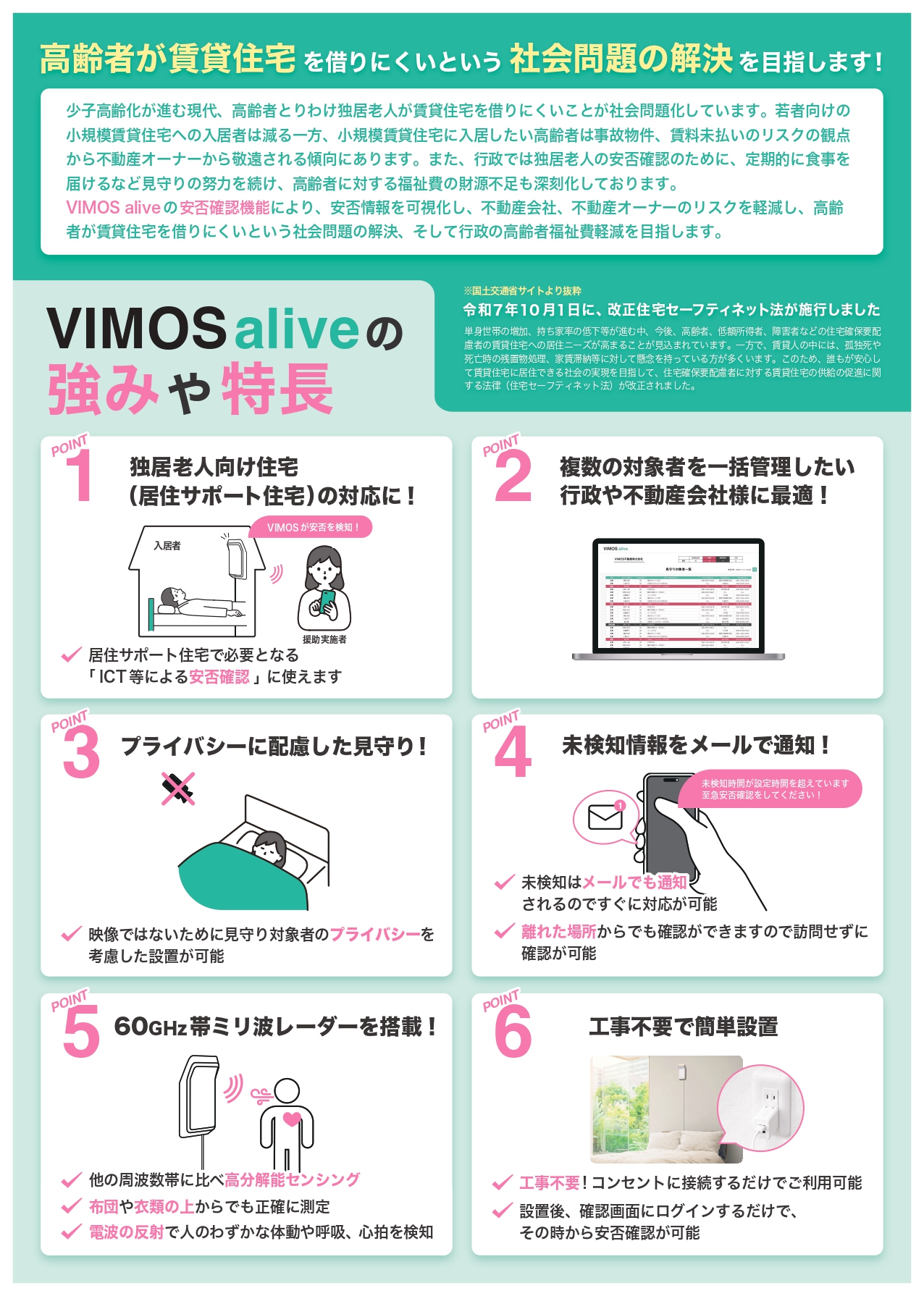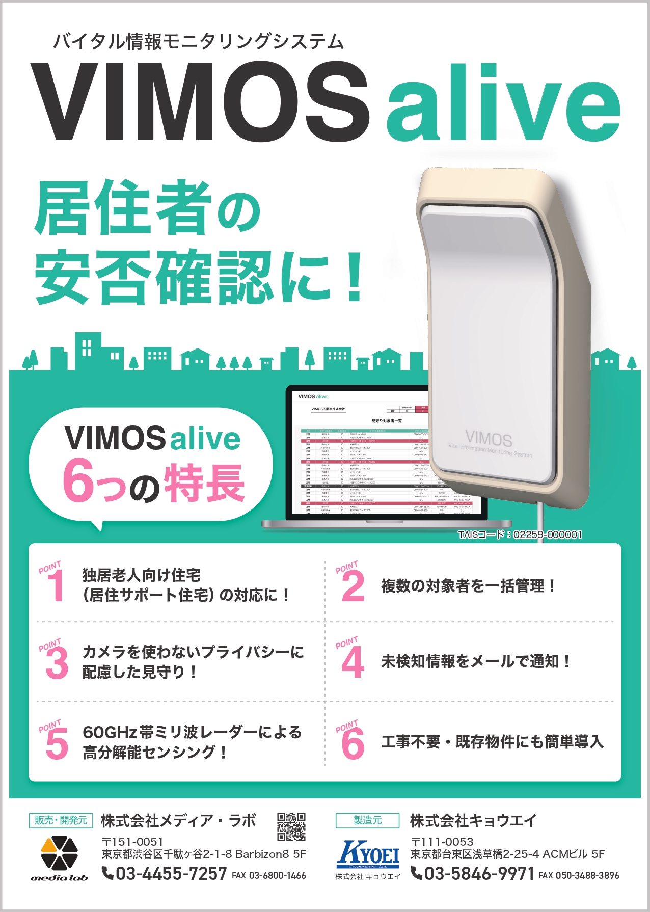 今回紹介した「VIMOS alive」は、在宅見守り向けの「VIMOS」をベースに、独居高齢者の見守りに課題を抱える不動産管理会社での導入を目指して開発したモデルです。